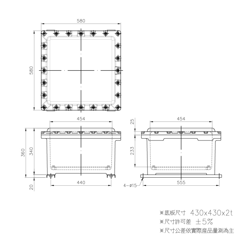 | 外型尺寸(mm) | L(圖A) 580 W(圖B) 580 H(圖C) 340 |