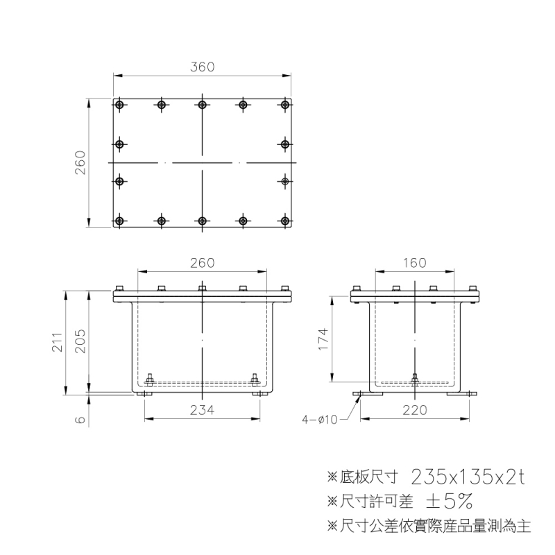 | 外型尺寸(mm) | L(圖A) 360 W(圖B) 260 H(圖C) 205 |