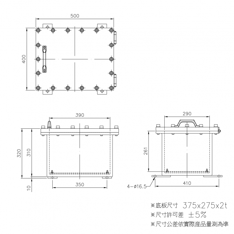 | 外型尺寸(mm) | L(圖A) 500 W(圖B) 400 H(圖C) 320 |