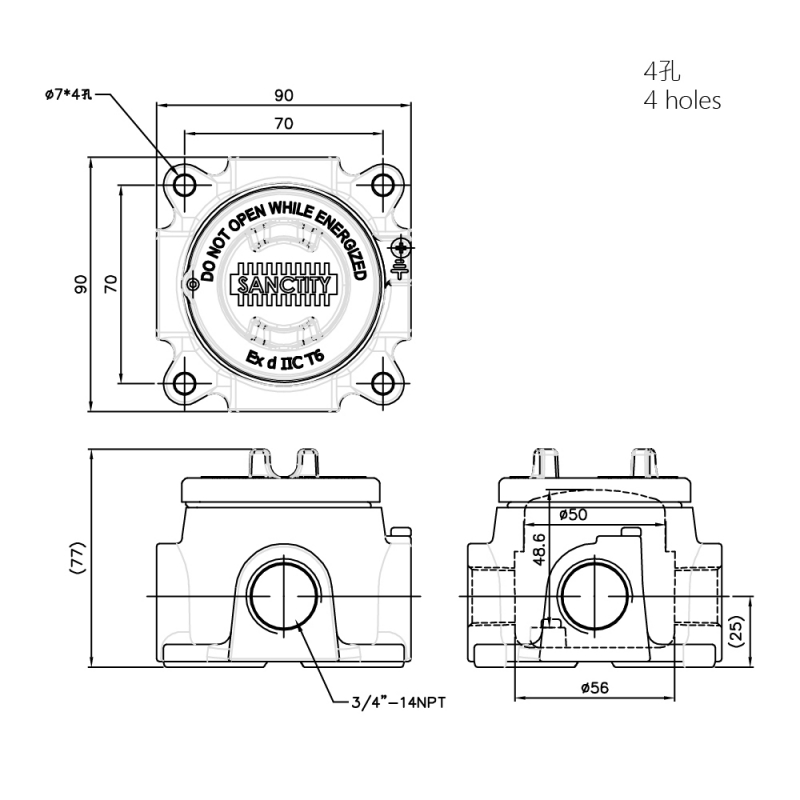Ex d ,3/4",4孔(鋁合金)φ56*90*77,Ex d IIC T6 Gb X,Ex tb IIIC T85℃ Db X