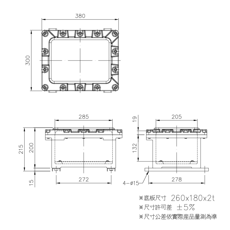 | 內部尺寸(mm) | L(圖D) 285 W(圖E) 205 H(圖F) 151 |
