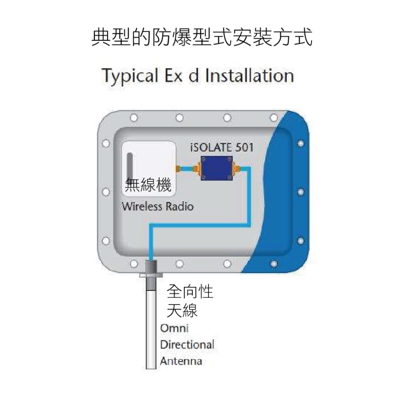 防爆無線基地台的RF輸出是電鍍隔離使產品做為本質安全型式防爆,適用各廠牌Wireless無線AP,並且可選擇他牌認證天線一起使用的防爆無線設備。