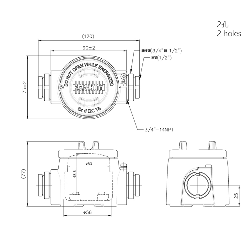 Ex d ,3/4",2孔(鋁合金)φ56*90*77,Ex d IIC T6 Gb X,Ex tb IIIC T85℃ Db X
